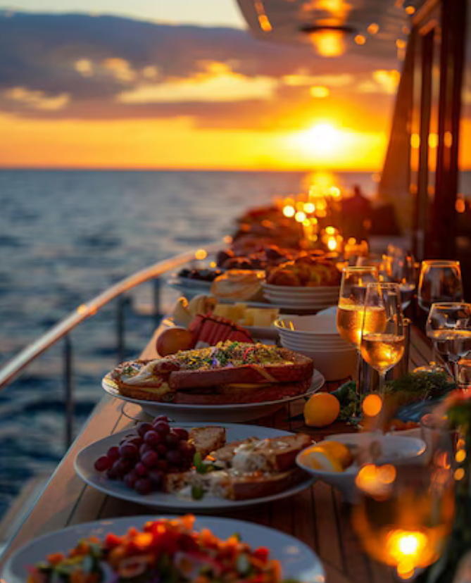 Eğlenceli organizasyonlar için hazırlanan özel atıştırmalık ve içecek seçenekleriyle tekne turunuzun keyfini artırın.